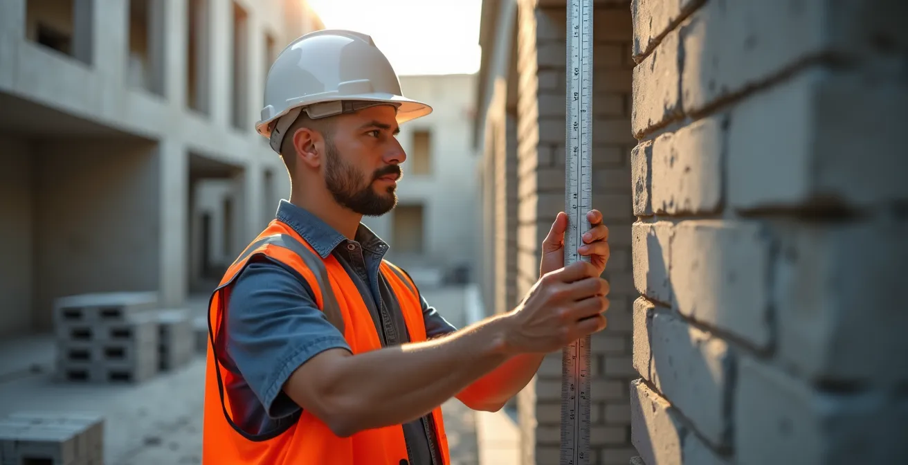 Pour le prouver, vous devez suivre un protocole de mesure rigoureux. Munissez-vous d’une règle de maçon en aluminium de 2 mètres, d’un niveau à bulle ou, idéalement, d’un fil à plomb. Appliquez la règle verticalement contre le mur et mesurez l’écart le plus important à l’aide d’un réglet. Prenez plusieurs photos claires où l’on voit simultanément la règle, le point de mesure et le réglet indiquant l’écart. Placer une pièce de monnaie à côté peut servir de témoin métrique. Un cas pratique discuté sur des forums de construction montre qu’un faux aplomb de 3 cm sur 5 mètres, bien que jugé non catastrophique structurellement, reste largement hors des tolérances du DTU (qui seraient de 5000mm/300 = 16,7 mm). Cette documentation chiffrée et visuelle constitue la première pièce maîtresse de votre dossier.